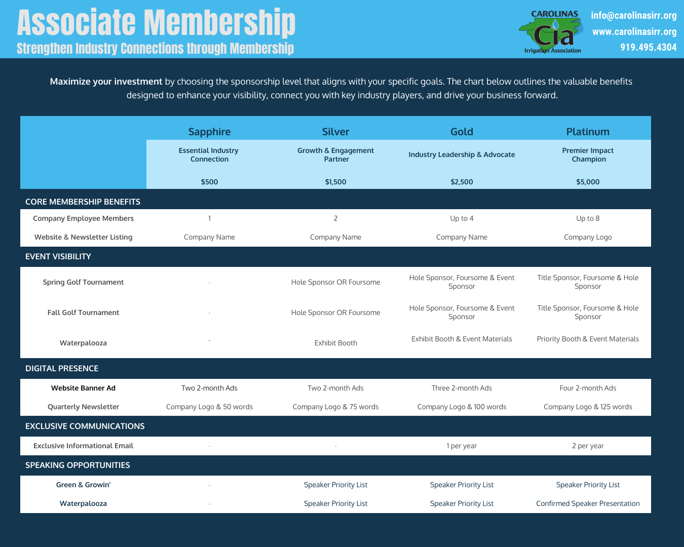 Associate Membership ProgramIf you are looking to reach irrigation and landscaping contractors throughout the Carolinas, then look no further than CIA’s annual Associate Membership program, which delivers high-impact marketing and quality face-time with the decision-makers. Our Associate Membership provides strong core benefits and the ability to choose the level of sponsorship that best suits your needs. About CIASince 1982, CIA has been a resource for irrigation contractors and suppliers from North and South Carolina. CIA was created as a unified voice to our industry and the issues that we face. Our mission is to provide educational opportunities; endorse ethical business practices; create working relationships with other green industry groups; influence industry friendly legislation and regulations; and raise the level of understanding of our industry by the public.
